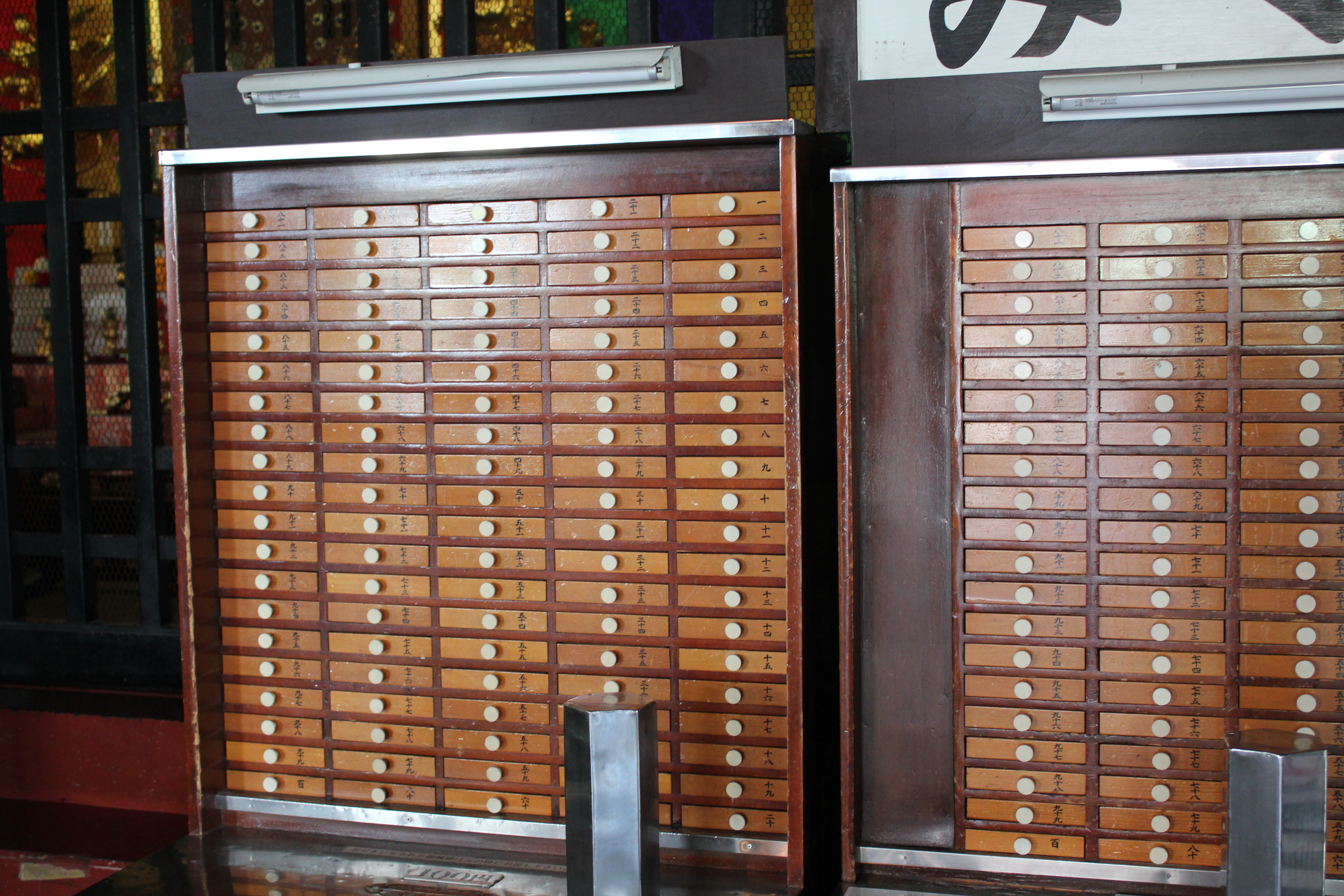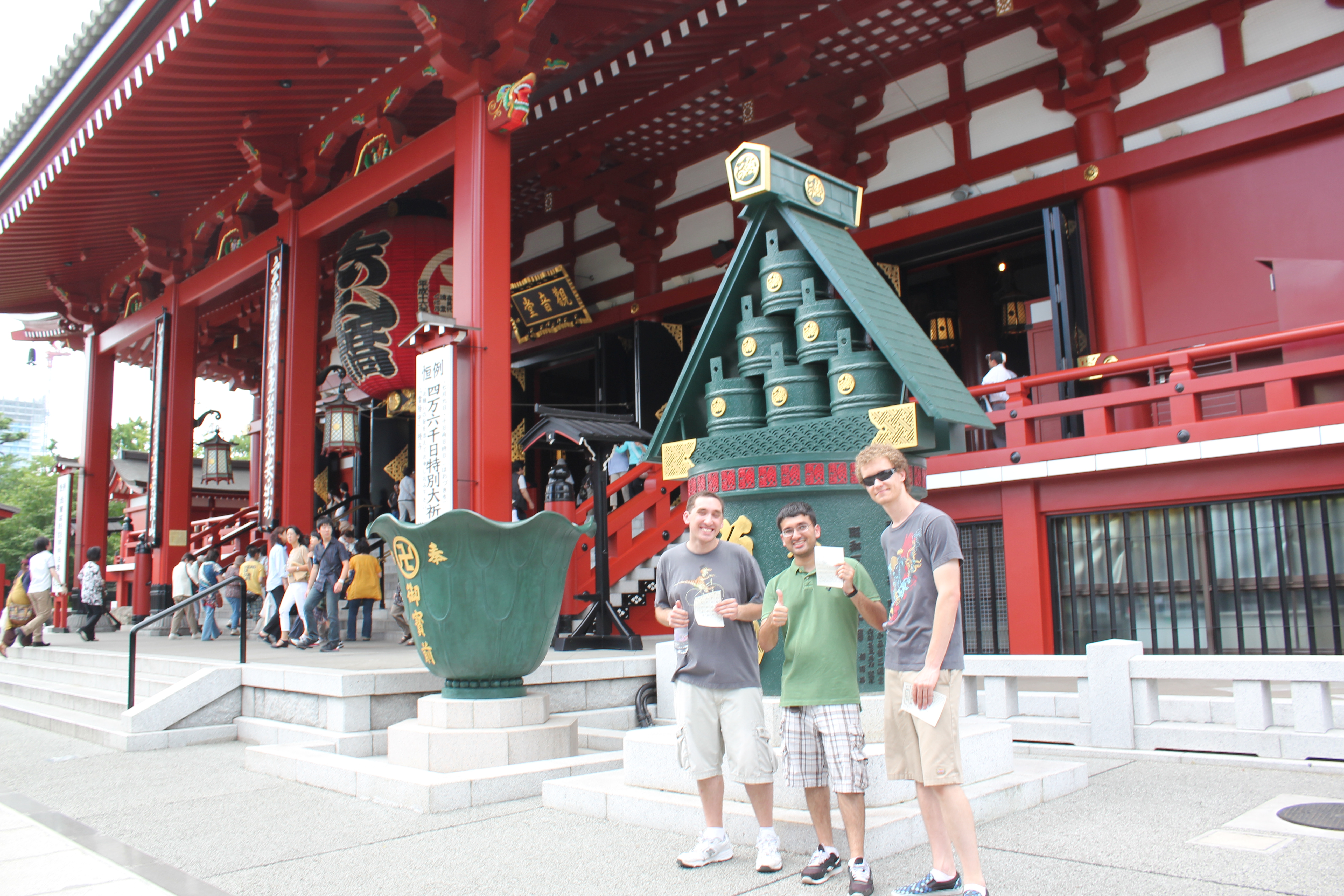 In our earlier wanderings we had noticed a pagoda sticking out above some of the rooftops and decided to check it out. When we got there, we realized that it was a part of Sensou-ji, a magnificent temple that also happened to be on my list of shrines to visit. We all got fortunes inside the temple, after a donation of 100 yen. There is a table inside with a wooden box full of sticks and a hole in the top big enough for just one of them. You shake the box a bit and until one comes out and read the number on the tip of the stick. On the wall by the table are a bunch of drawers with numbers matching the sticks, which each hold a different fortune. Our fortunes ran the full gamut, with Tim grabbing "best fortune", Brian getting "good fortune", myself managing a "regular fortune", and Kirt cursed with a "bad fortune". Tim's "best fortune" became a running joke for the trip, with any good happenings immediately attributed to "best fortune".