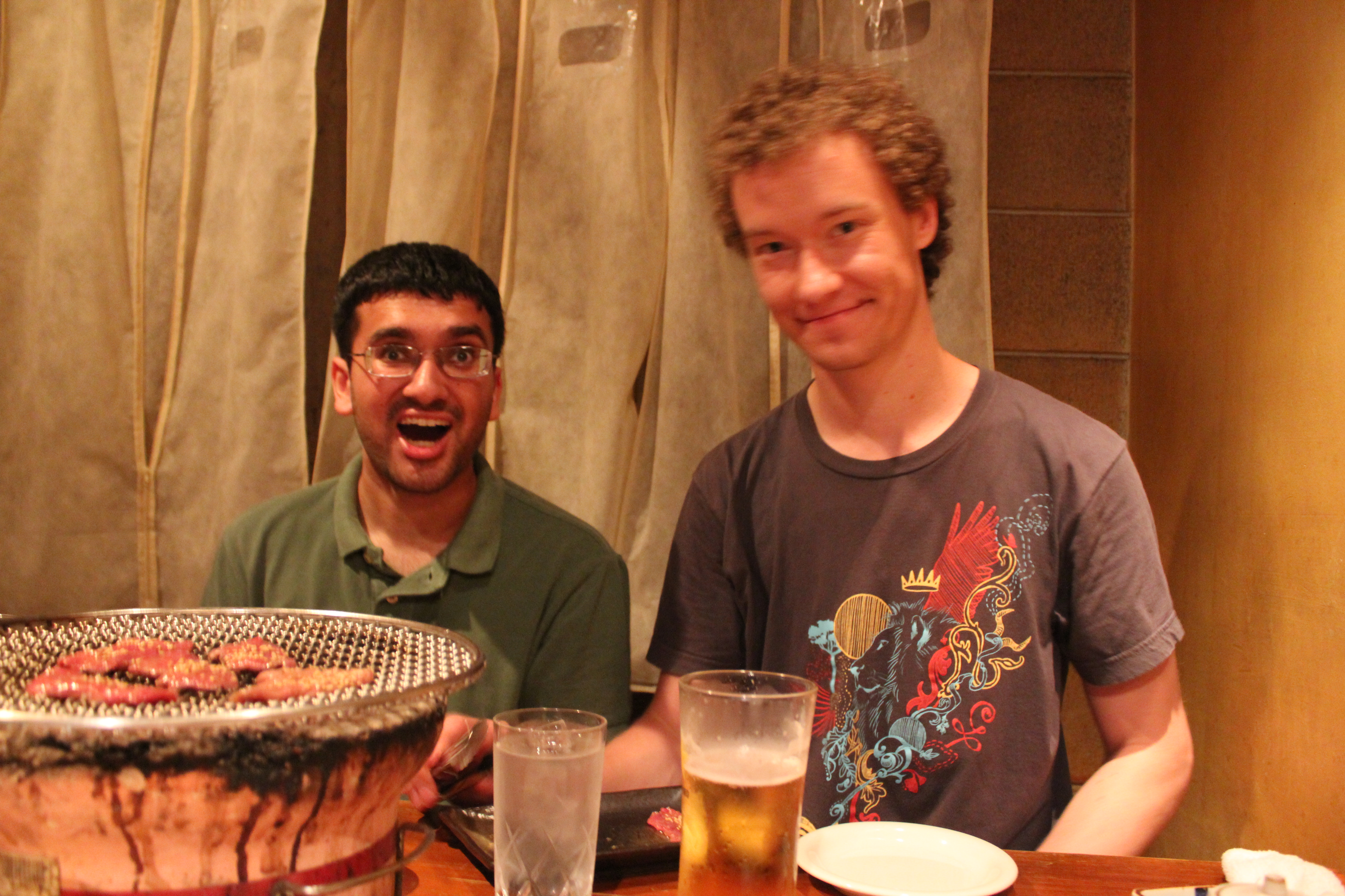 While wandering around looking for a place to eat dinner, a certain yakiniku place caught our eye. We were looking at the menu posted outside when someone approached us offering a coupon to another yakiniku place down the street. Amused by such poaching, we obliged. Yakiniku is similar to Korean BBQ in that you have a grill at the table and order small cuts of various seasoned meats which you then cook to your liking. Although we had a little trouble with the grill flaming up, it was a great meal.