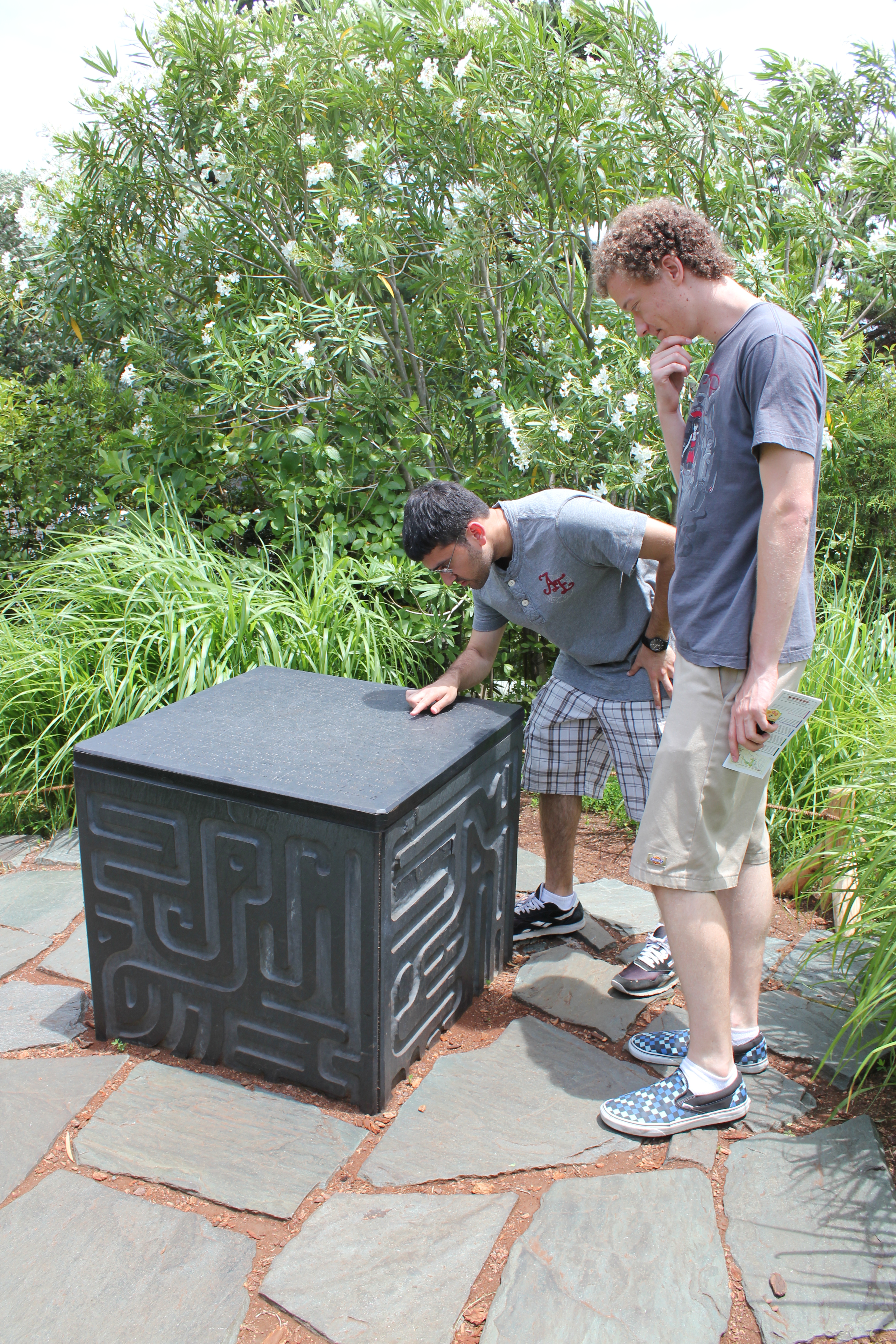 There was at least one school field trip there, and there were a ton of kids running around. There were people of all ages, however, and a good chunk of foreigners. We even ran into a guy from Tennessee who was visiting with his family. Apparently he had grown up in Japan, but his English was perfect. He took a picture of us in front of a giant statue of the robots from Laputa: Castle in the Sky, which none of us had watched at the time. One of the coolest things to see, though, was a small room in which they made what appeared to be original storyboards for Ponyo and Arriety available for visitors to page through. I found it very cool to be able to browse through these books and try to decipher the notes that covered each page.