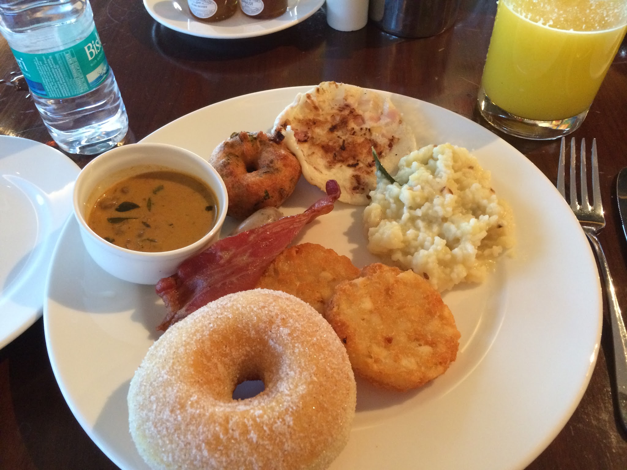 Most week days played out similarly, and they always started with the breakfast buffet at the hotel. The buffet consists of a selection of Indian dishes along with more familiar breakfast foods. I like to load up on a mix of the two, frequently including a selection of curry, some Indian bread (typically paratha or iddly), pongal (a rice dish with a similar consistency to oatmeal), hash browns, muffins, and donuts.