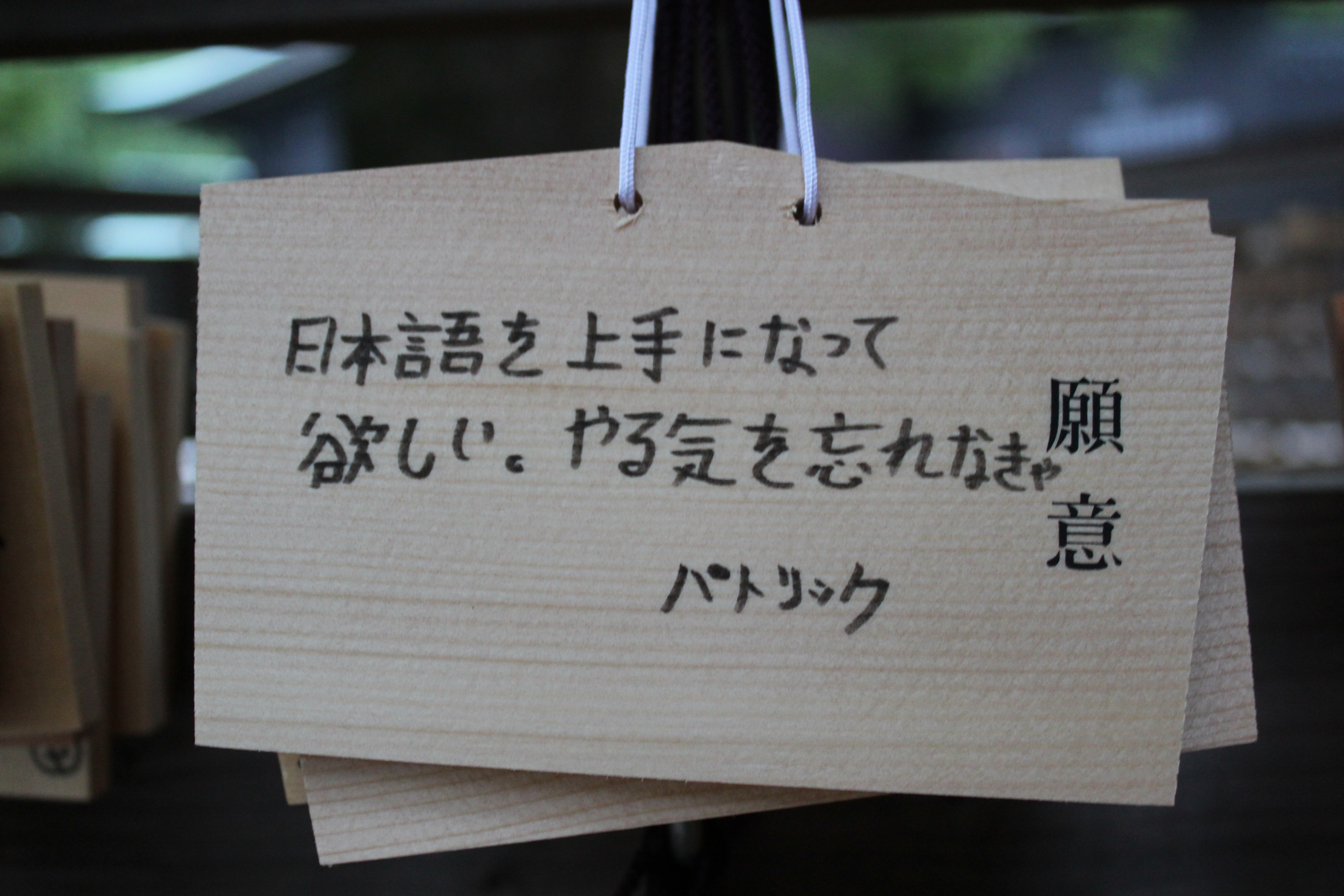 Yoyogi Park is more of a forest with a wide path cut through the middle, and blocks out the surrounding city completely. After a short walk we entered the shrine and paid our respects before heading over to the shop. There, we bought some charms (mamori, 守り) for relatives and also some wood tablets for wishes. There are boards in one area of the shrine with a bunch of nails in them, and after you write your wish on the wood tablets you hang them on the board. Wishes can be anything from general "world peace" to simply "do well on my upcoming test". Kirt and Brian wished for general peace and good lives, and mine was more of a commitment to continue learning Japanese. I wrote my wish in Japanese, though upon subsequent inspection I screwed it up a bit. Oh well.