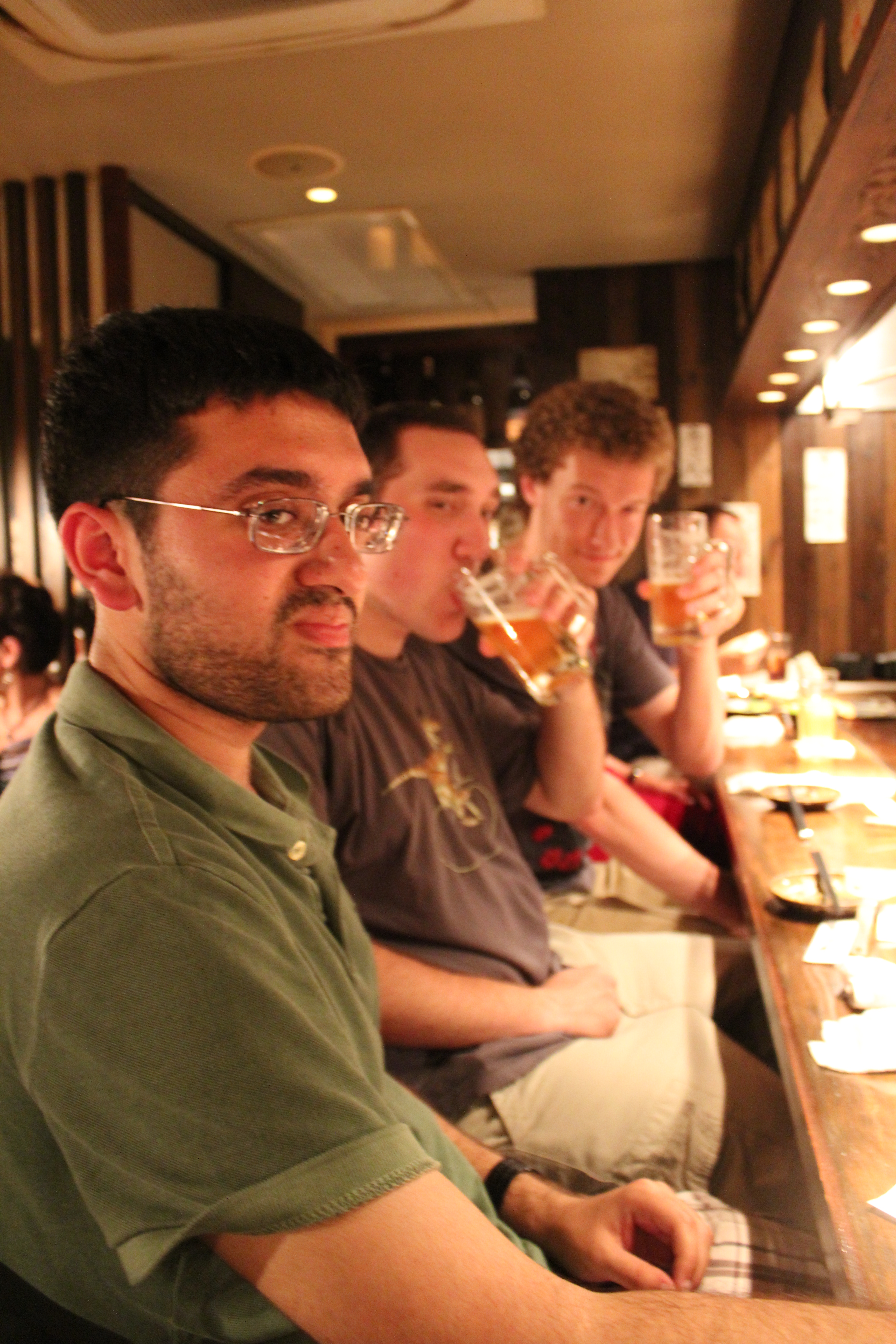 We had been wanted to go to Okonomiyaki (お好み焼き meaning roughly "fried whatever-you-like") for dinner for a while, so we decided to go to a nearby place while in Harajuku. Okonomiyaki is often described as a "savory pancake", but it is a pancake in form only. They use a little batter to cement the ingredients together, but for the most part it is just a bunch of meats, fish, and veggies thrown together on the grill. It was delicious, and Tim and I had some fun trying various drinks from the menu (Tim was particularly fond of the "Moscow Mule"). We sat at the bar in the restaurant, which was kind of a cool experience as well. At the bar you sit right in front of the huge flat grill that your meal is cooked on, and when your food is ready the chefs simply slides it over to you on the grill. You get a small spatula so you can cut off little pieces onto your personal plate.